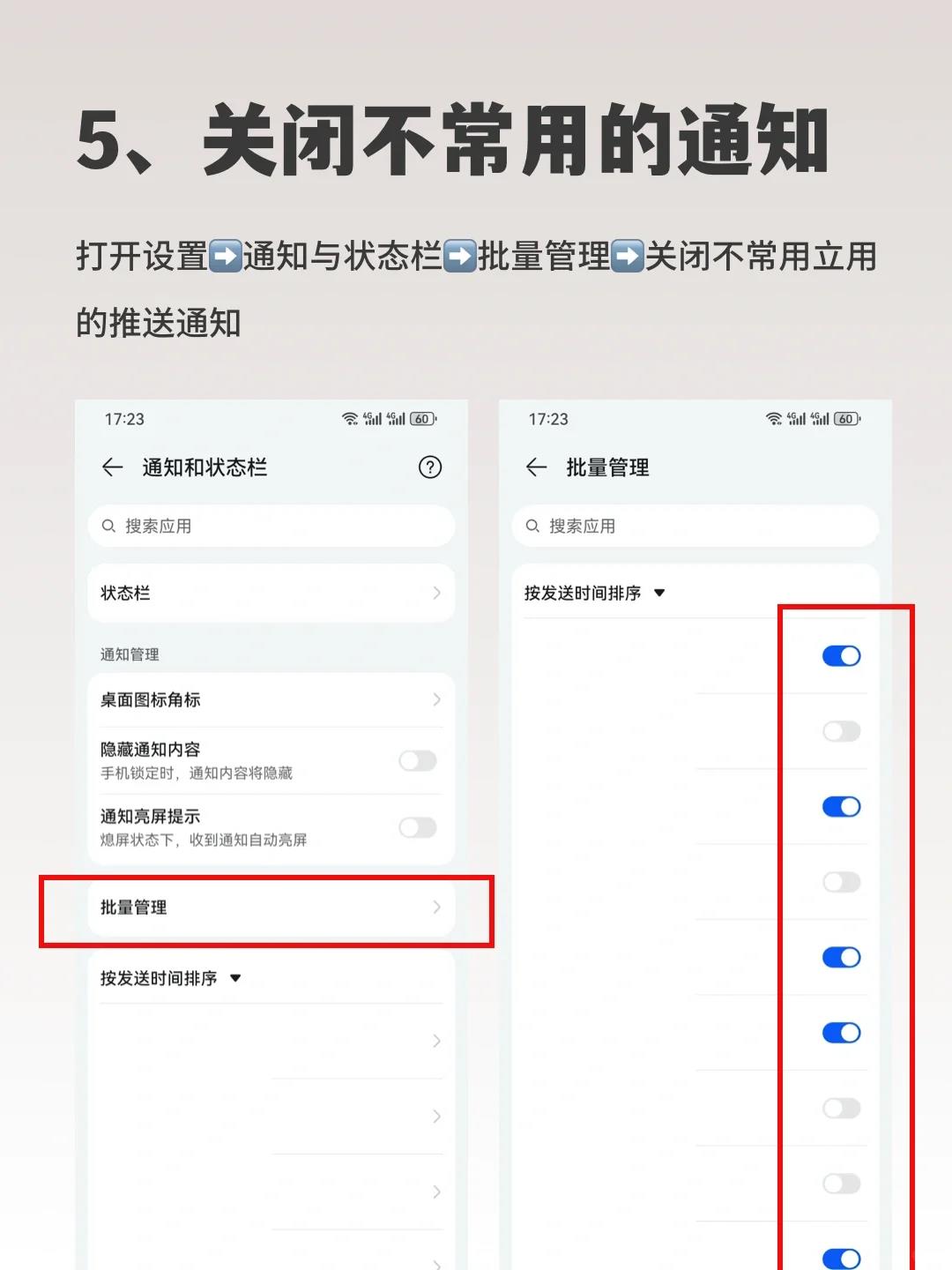 打开设置——通知与状态栏——批量管理——关闭不常用立用的推送通知