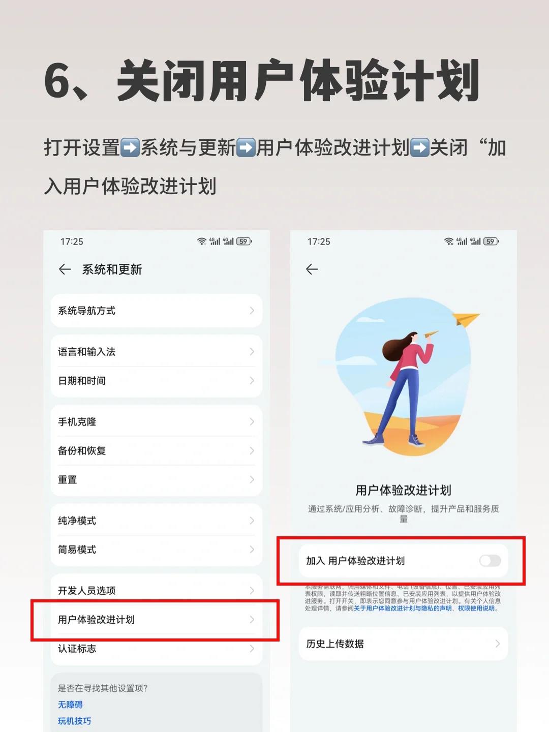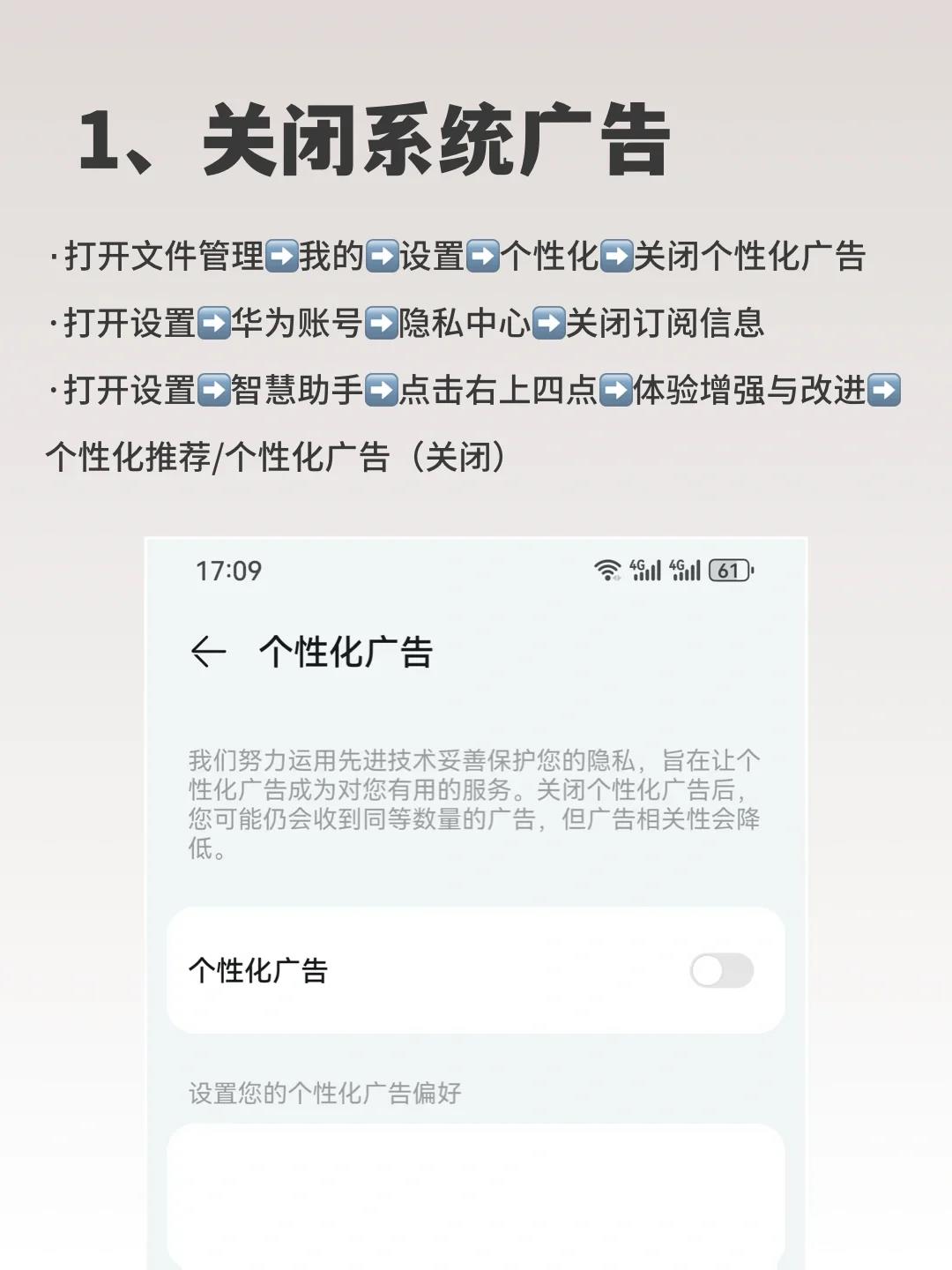 打开文件管理——我的——设置——个性化——关闭个性化广告——打开设置——华为账号——隐私中心——关闭订阅信息——打开设置——智慧助手——点击右上四点——体验增强与改进——个性化推荐/个性化广告 (关闭)
