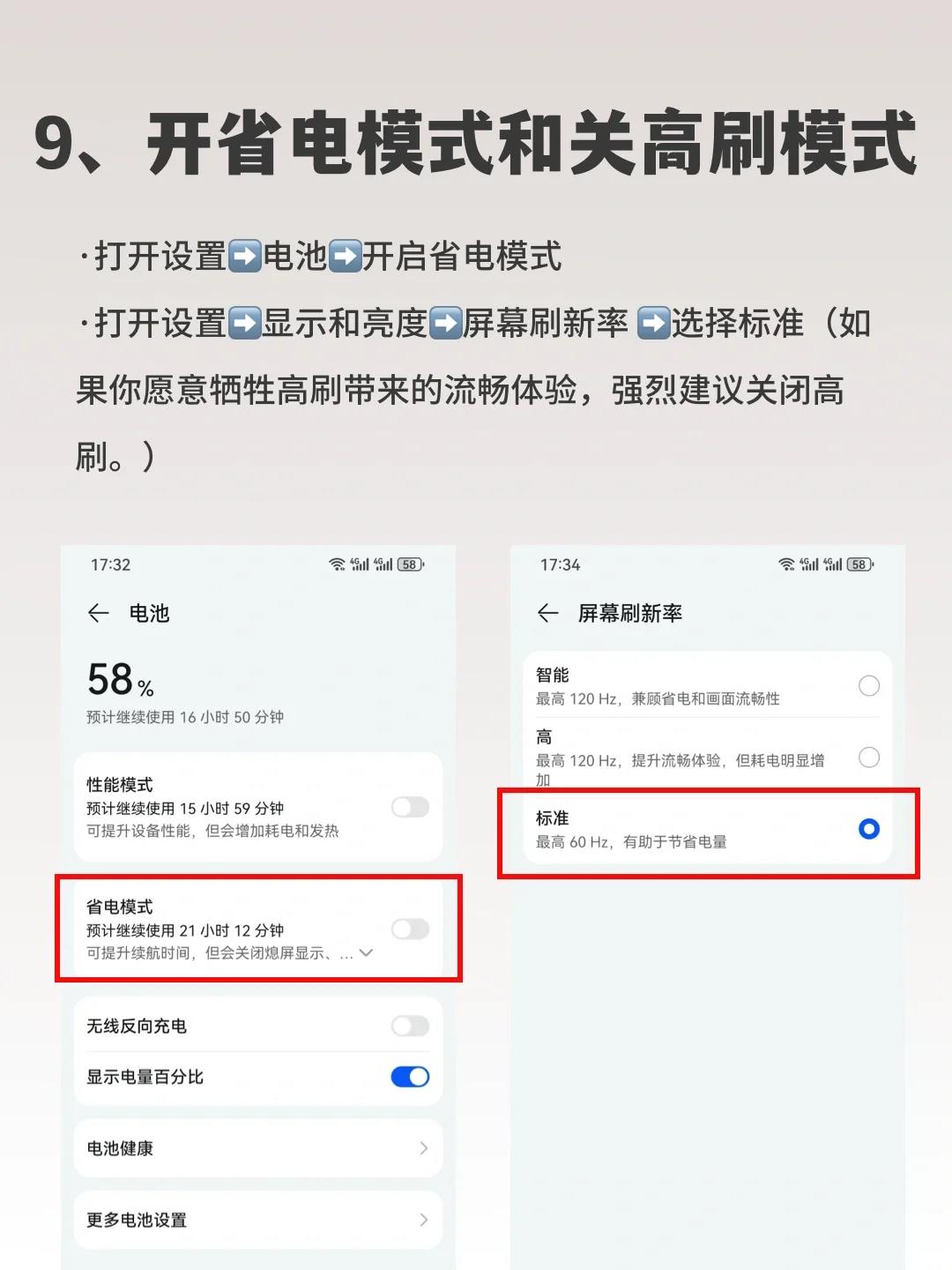 打开设置——电池——开启省电模式——打开设置——显示与亮度——屏幕刷新率——选择标准。