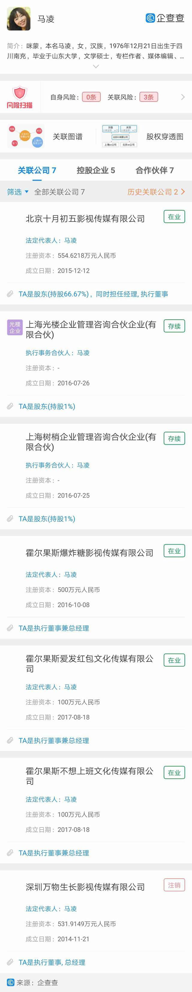 企查查显示咪蒙关联企业共7家,其中担任法人7家,控股企业5家。