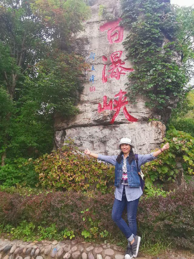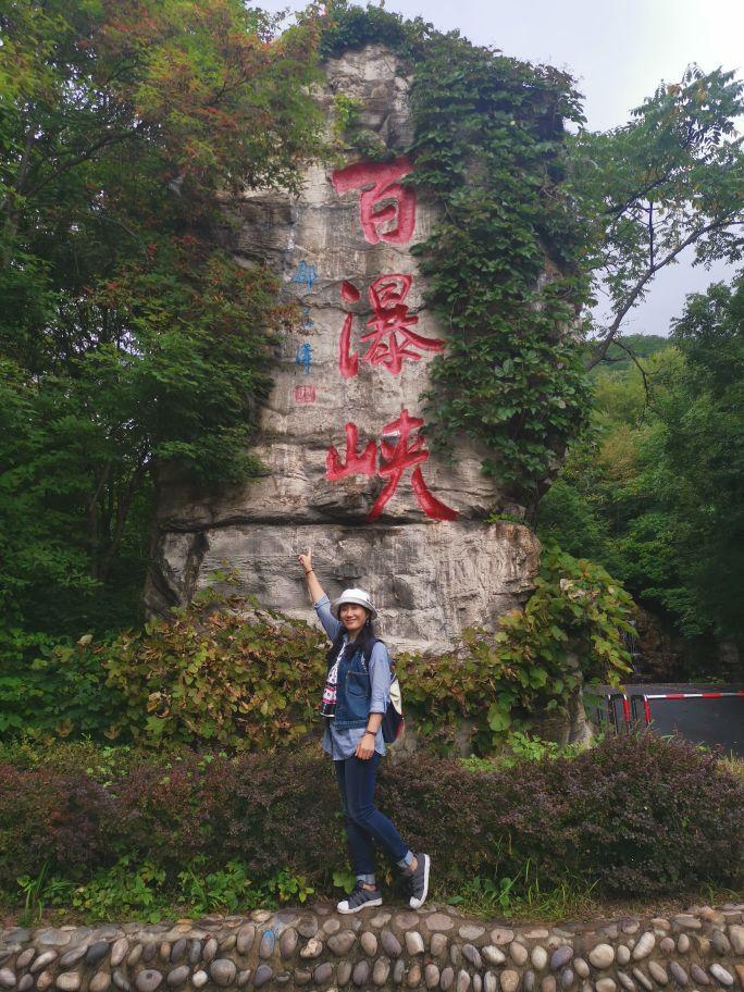 刚一下车,我就被门口一块耸立的巨石深深地吸引,淡淡的石纹花色,“百瀑峡”三个鲜红的大字苍劲有力,再往里走,一块圆形大石上,几位大妈或趴或站在“上善若水”四个隶书大字的上方不停的摆姿拍照,巨石背面的青苔,仿佛一个绿色的童话世界娇艳欲滴。