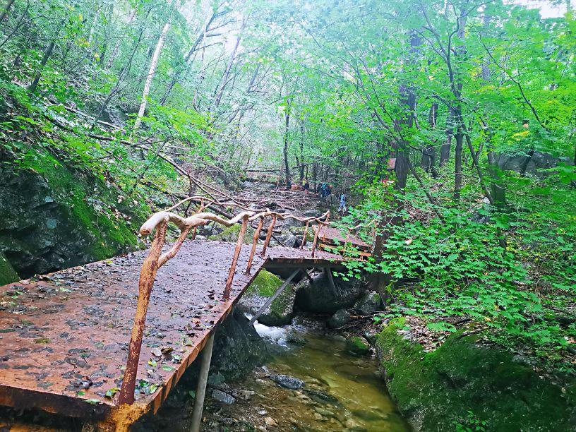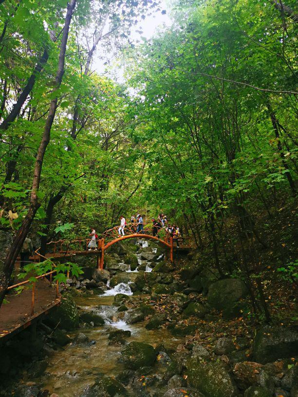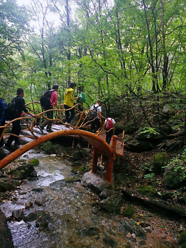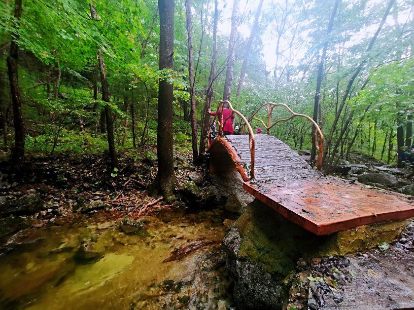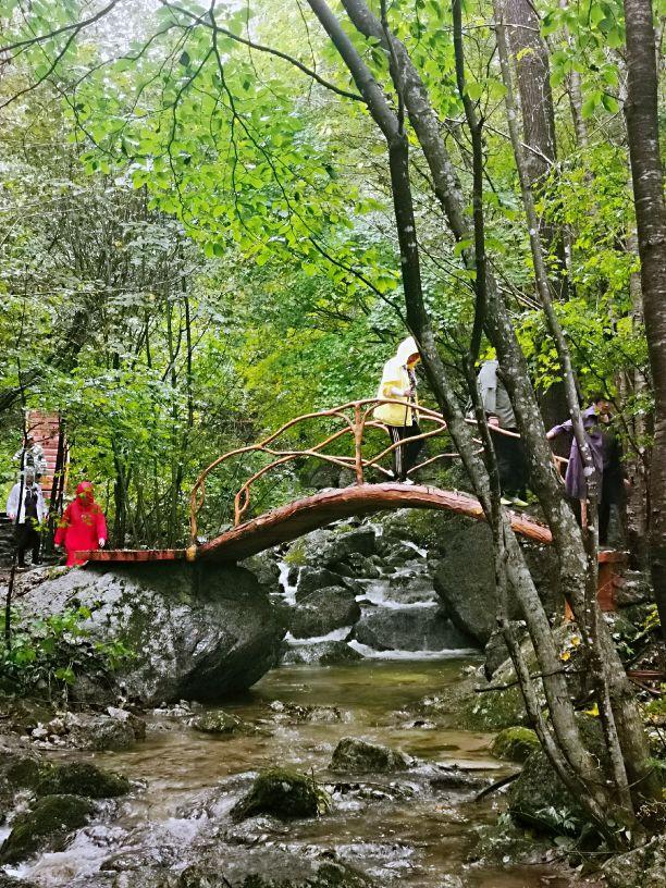 相对于那些翻腾的白色水花,那参天的大树,那绿色的碧波以及苁蓉叠翠的林木,我更喜欢那些凌驾于潭水之上不同形状的仿木小桥,或高或低,或曲或直,或长或短,形状各一,仿木纹结构,与周围环境台阶高低起伏,或多或少,远远望去,几座小桥犹如一条条彩带为幽深的峡谷增添了几分活力与灵气,又仿佛在前方召唤着,让你继续前行去探究峡谷深处的秘密。