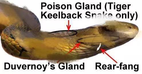 但是不可忽视的是,虽然没有“鸡冠蛇”那么厉害,但是虎斑游蛇同样也属于剧毒蛇。虎斑游蛇没有毒牙,都是无毒牙,但是却拥有两大“伤人神器”。首先,虎斑游蛇的颈槽内有两条颈腺,都可以分泌毒液,这意味着它有着双毒腺。虎斑游蛇的颈腺毒液并非自己合成,而是通过“收集”而来。