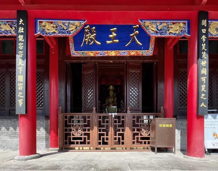 天王殿正中供奉天冠弥勒菩萨,现在寺院所有殿堂都不能进入朝礼,只能门口顶礼。