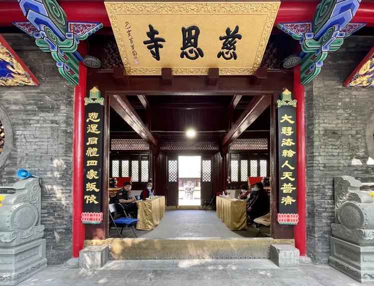 检查通行码和测量体温后进入寺院,提醒必须全程戴口罩。
