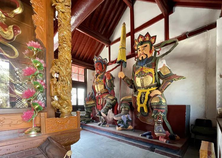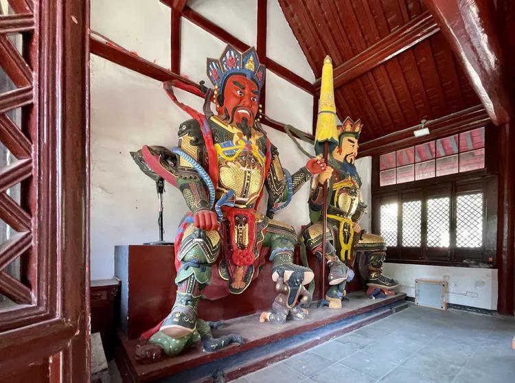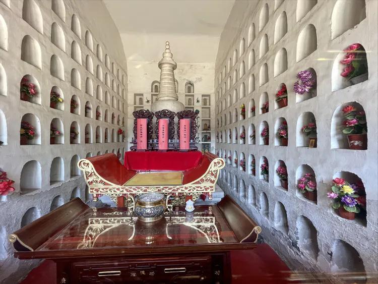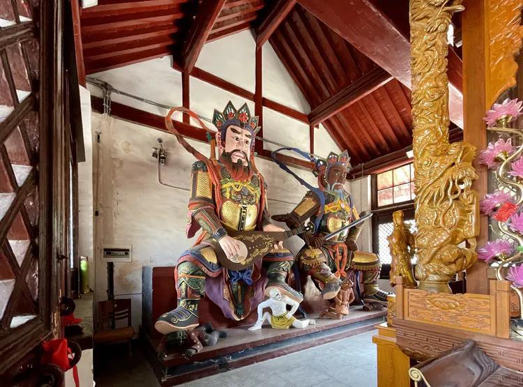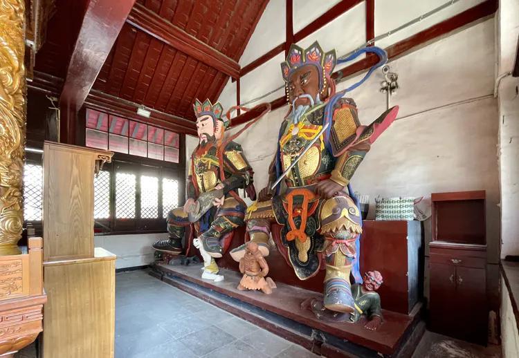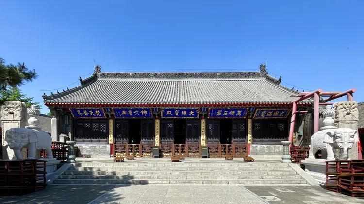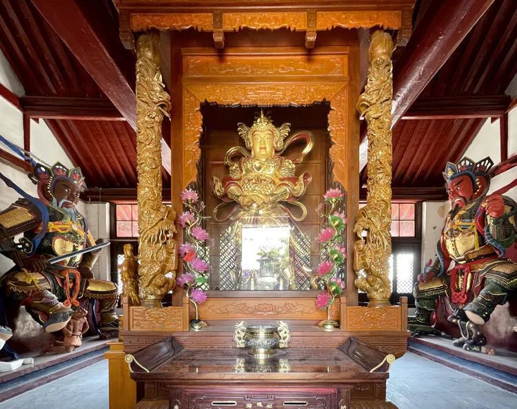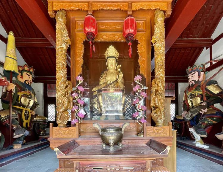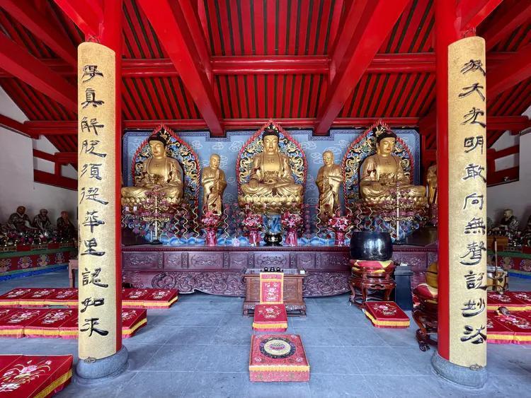 大雄宝殿正中供奉三世佛,两边是十八罗汉,后墙两边是四大菩萨(观世音菩萨、地藏王菩萨、文殊菩萨、普贤菩萨),后方是观世音菩萨。