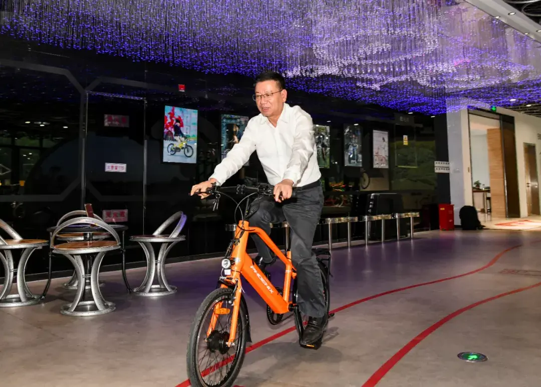 走进凤凰展馆,一辆辆风格迥异、时尚动感的自行车映入眼帘。胡卫国现场参观企业自主研发产品,详细了解企业设计理念及品牌文化介绍,并骑上车体验了一番。
