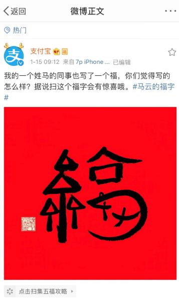 今天,支付宝官方微博曝出了马云为大家今年过春节所写的“福”字。据说扫这个福字会有惊喜:大概率能够扫到一张沾福气卡,可以在支付宝上从朋友扫得的福字里“沾”来自己想要的那一张。小编亲测有效,确实是扫到了!