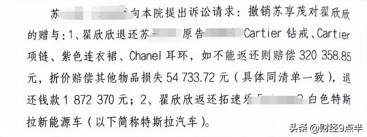 3月31日,北京市朝阳区法院判决:翟欣欣退还给苏享茂家属现金、汽车共千万,还有撤销翟欣欣在海南、北京两套房产的所有权。
