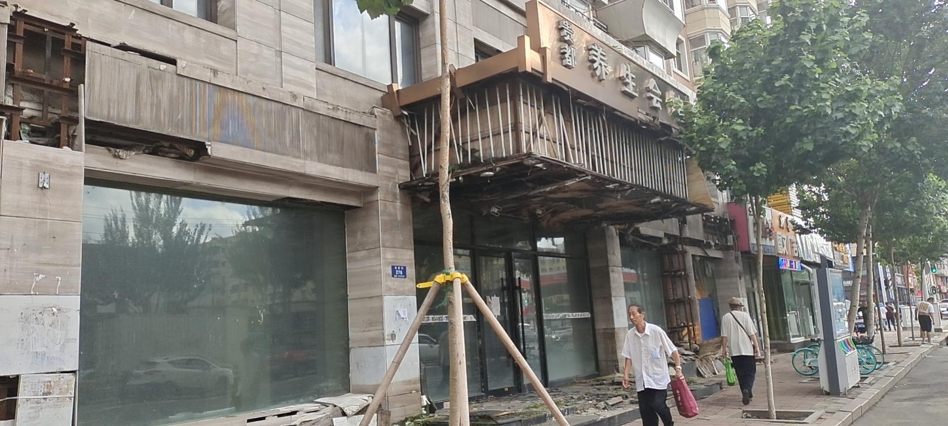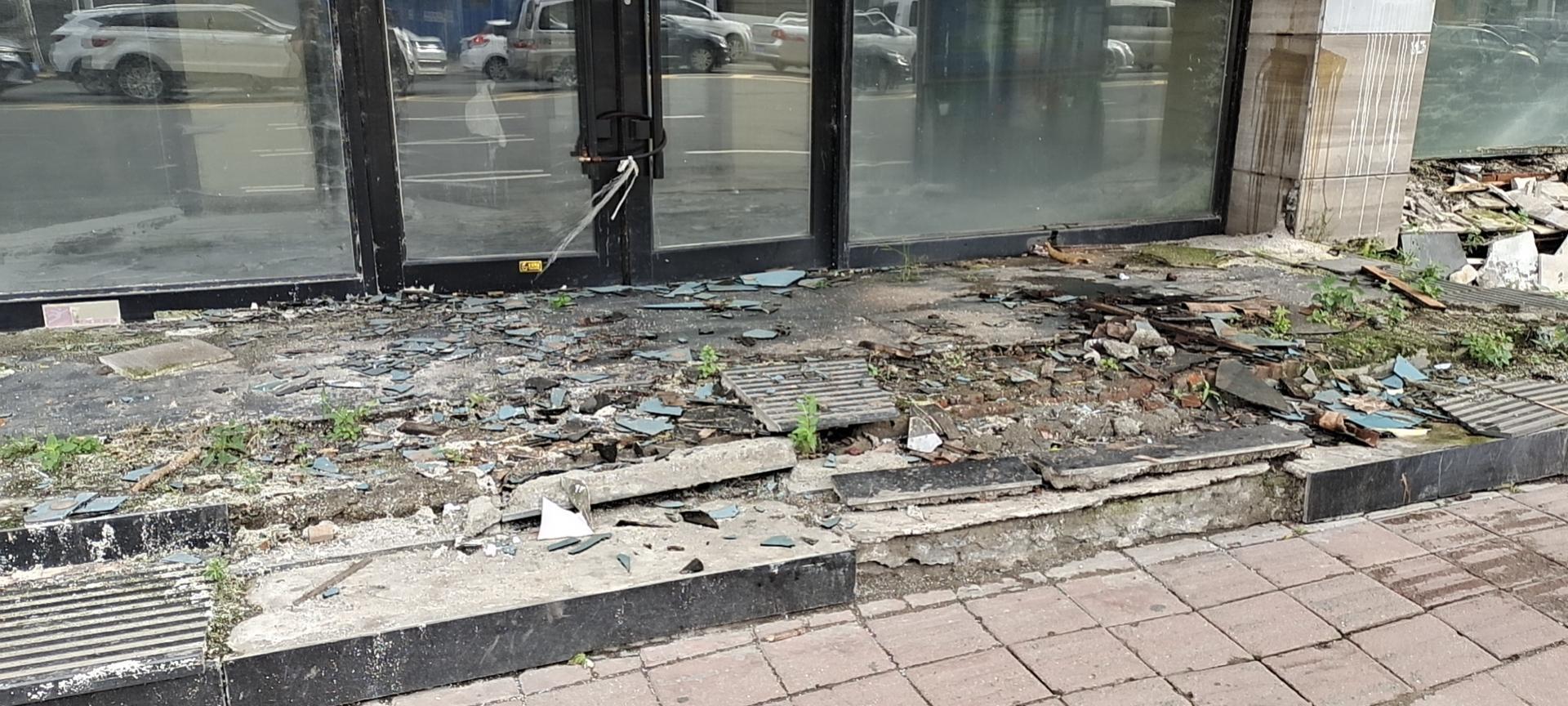 4日,记者来到贵都养生会馆,发现该店门口台阶破损不堪,墙体瓷砖大面积碎裂脱落,玻璃碎裂严重,碎片也明晃晃掉落在附近地面,建筑垃圾也在地面上靠边摆放,店面门脸处雨搭已经“面目全非”,木板断裂、雨搭顶上的电线都裸露着,一些照明灯在摇摇欲坠。