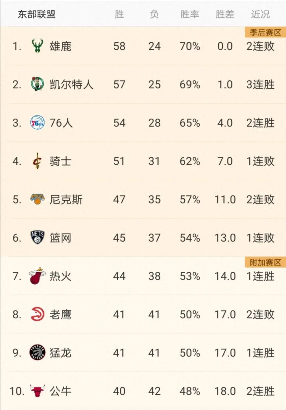 1、东部联盟的1-6分别是雄鹿、凯尔特人、76人、骑士、尼克斯和篮网,排名7-10的是热火、老鹰、猛龙和公牛进入附加赛争夺战,接下来将由热火和老鹰争夺东部第7,猛龙和公牛争夺东部第8;谁将最有可能搭上季后赛的末班车呢?