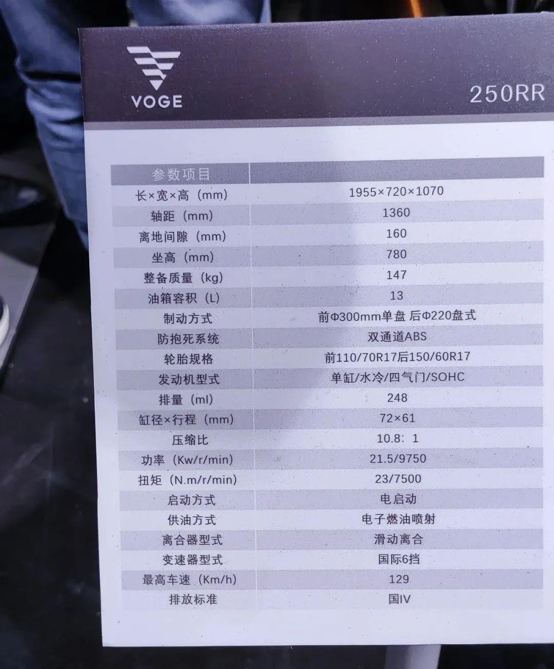 250RR的整备质量为147kg,在同级别中相当轻了,轮胎规格在250级别中也是比较宽的了,为前110后150。