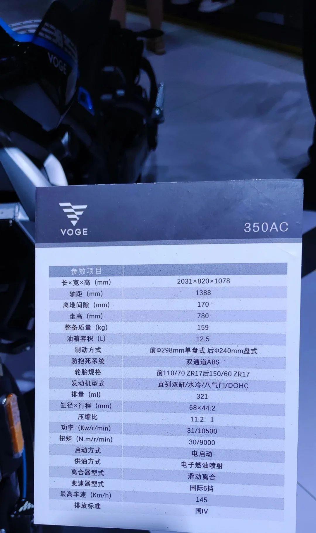 动力系统正式在凯越321R上使用过的那台322cc直列双缸发动机,最大功率29.5kW@10500rpm,最大扭矩29N·m@9000rpm。