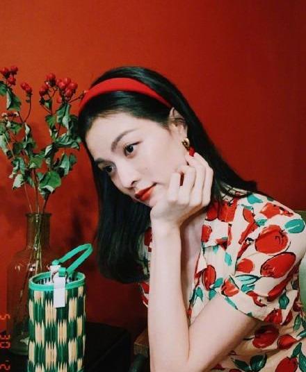 当然了,和全身的穿搭是否和谐也会影响到发箍佩戴的效果。这里和大家分享一个不容易出错的简单方法:从上装和下装服饰的配色中选择一种相近的颜色,不一定非得是大面色的颜色,像下图中钟楚曦选择的就是上装印花的红色,效果也很出色。