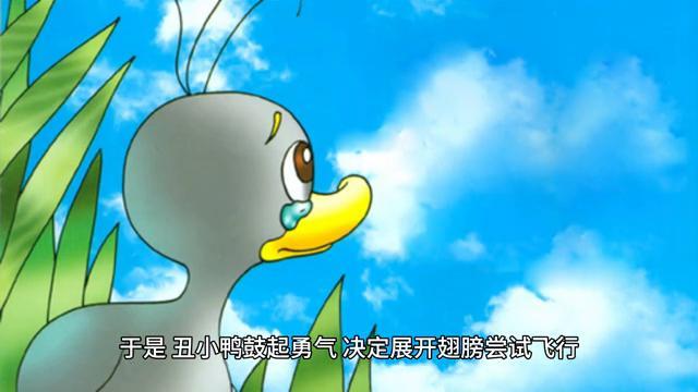 于是丑小鸭鼓起勇气决定展开翅膀尝试飞行。虽然初次试飞时丑小鸭摔得鼻青脸肿,但它毫不气馁继续努力练习,渐渐地丑小鸭的飞行技术越来越好。有一天当它飞过湖面时,惊讶地发现自己已经变成了一只美丽的白天鹅。