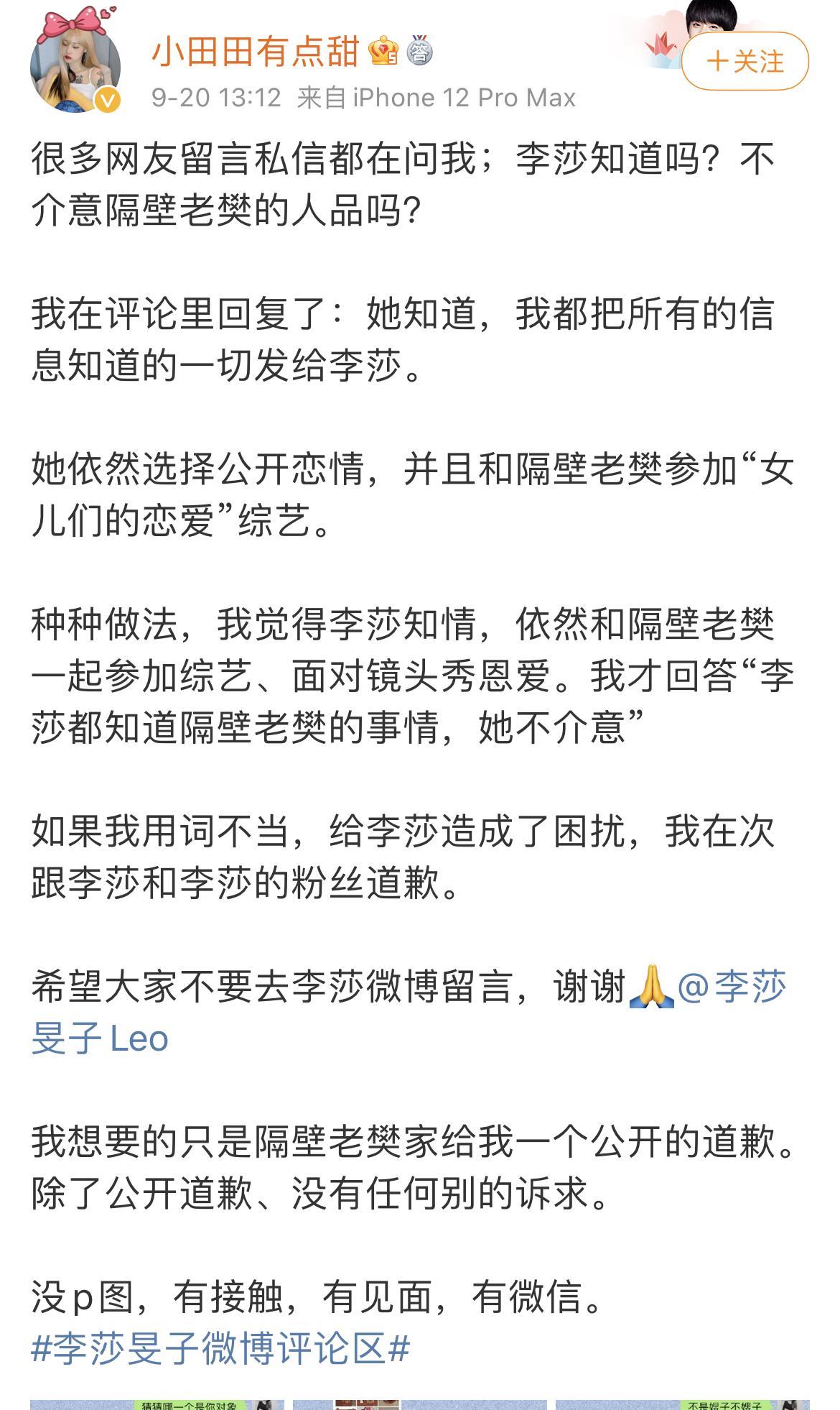 “小田田”还表示自己告诉过李莎旻子一切相关信息,但是其仍然坚持公开恋情,并与隔壁老樊携手参加《女儿们的恋爱》