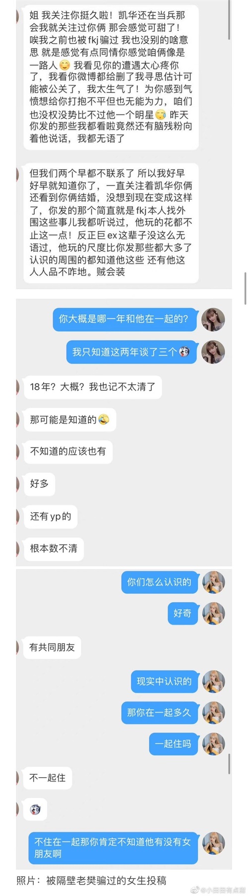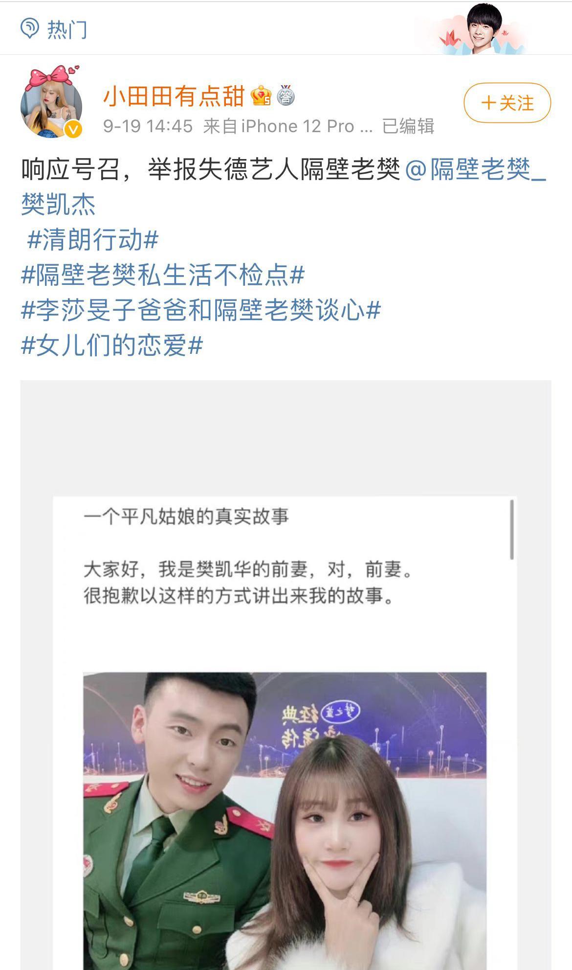 19日,一名用户名叫“小田田有点甜”的网友在社交平台爆出大量信息,指出隔壁老樊私生活混乱,在自己和其哥哥交往期间还要邀请他出去乱玩
