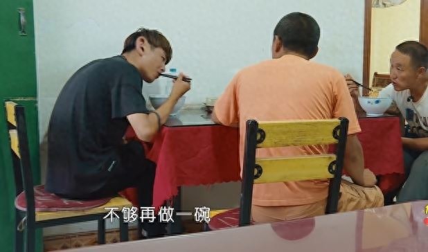 面条吃完后,农村的爸爸问有没有吃饱,如果不够的话再做一碗。