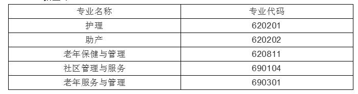 (1)对 口 专 业: 护理、护理(老年护理)、助产、社区管理与服务、心理咨询、口腔医学技术、护理(口腔护理)、医学影像技术、康复治疗技术、药学、医学检验技术、医学营养、食品检测技术、药品经营与管理、护理(英语护理)、护理(日语护理)和护理(德语护理)17个专业(含方向)。