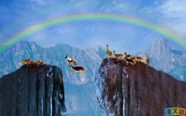 “山涧上空,和那道彩虹平行,又架起了一座桥,那是一座用死亡做桥墩架设起来的桥。没有拥挤,没有争夺,秩序井然,快速飞渡。”最终,没有谁帮它飞渡的镰刀头羊“迈着坚定的步伐,走向那道绚丽的彩虹……消失在一片灿烂中”。