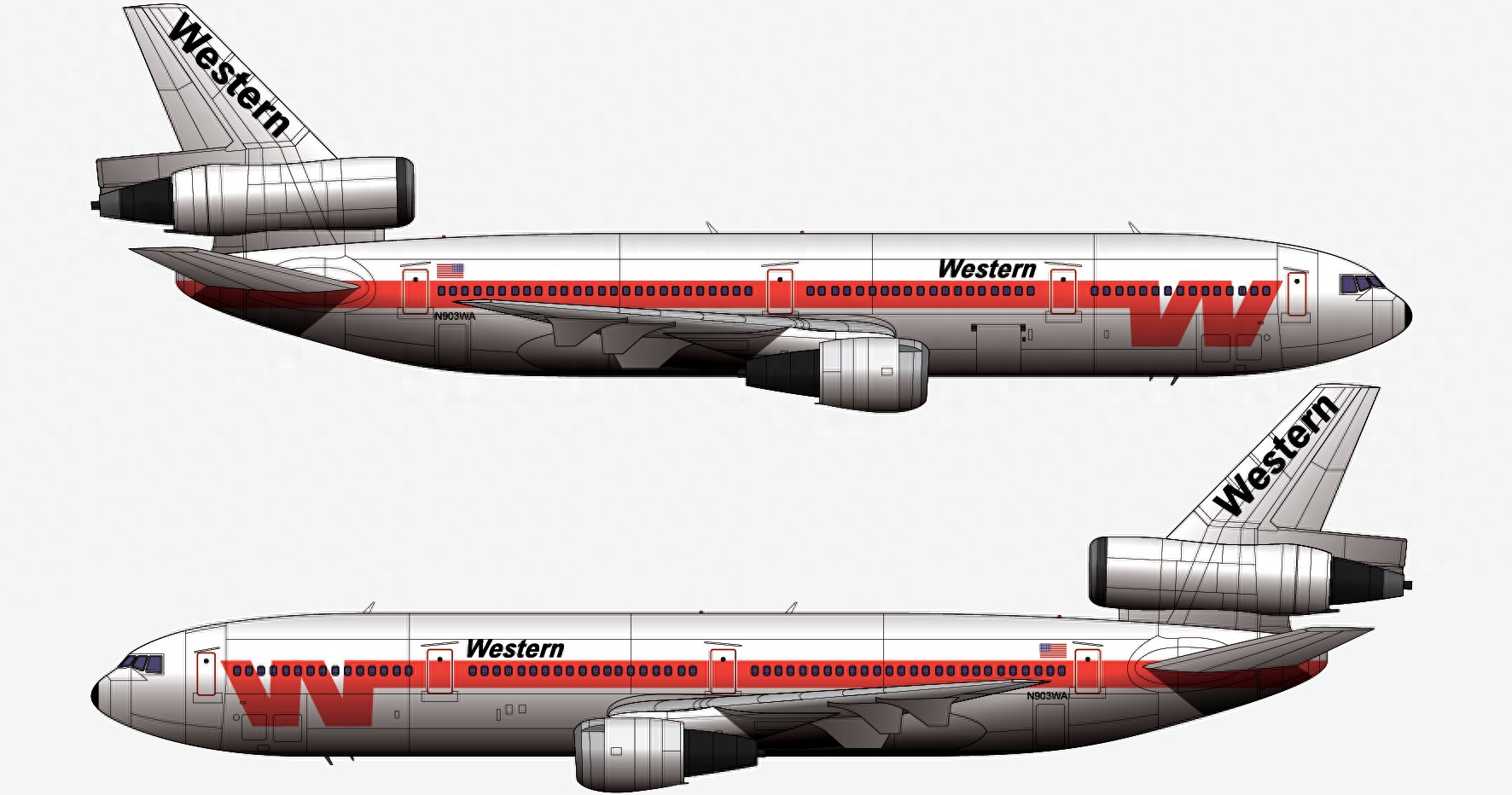 本厂长绘制的西方航空WA2605航班N903WA号DC-10-10型客机二视图