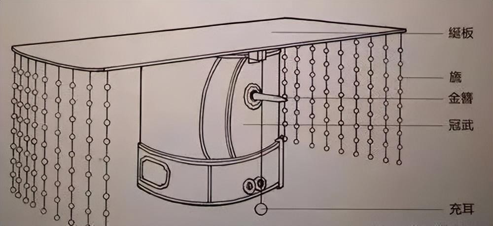 作为亲王的冕冠,九旒冕在各个部位彰显着与普通冕冠与众不同的特点,体现着古代贵族对于自身极高的行为约束:綎板,前圆后方,代表着古人天圆地方的宇宙观;前后垂下的旒和左右垂下的充耳,则代表着帝王要非礼勿视、非礼勿听。
