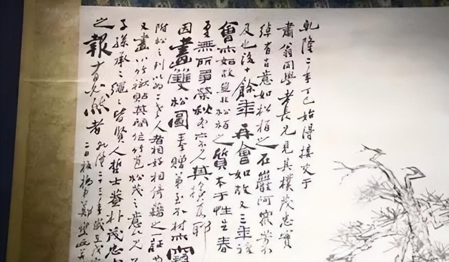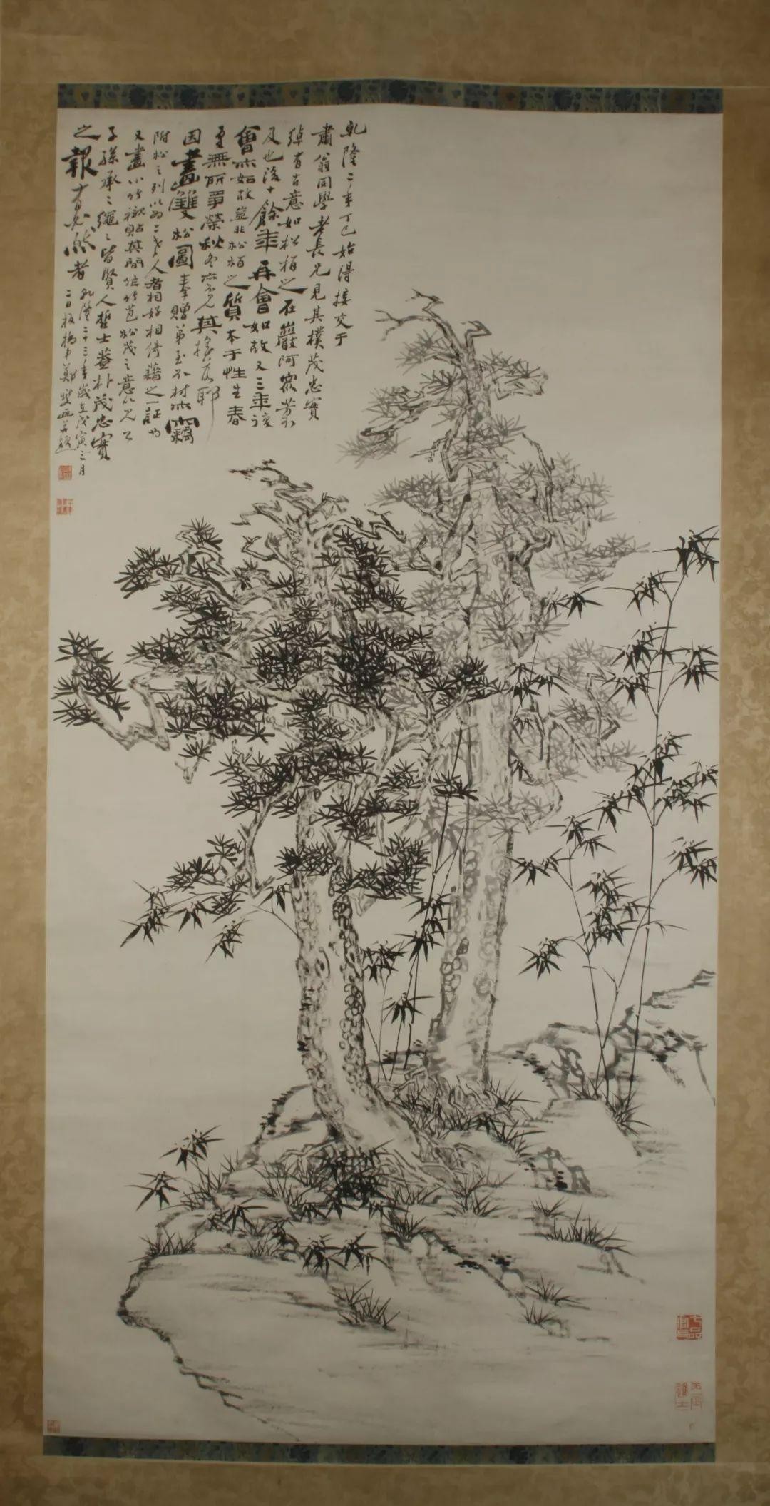 此画纸本设墨,画心纵201厘米,横101厘米。郑燮(公元1693—1765年),字克柔,号板桥,以号行世。江苏兴化人。是清代“扬州八怪”之一,以擅画兰、竹、石闻名。《双松图轴》是郑燮在乾隆二十三年送给好友肃翁的作品。这件作品书、画俱佳,保存完好,是难得一见的珍品。
