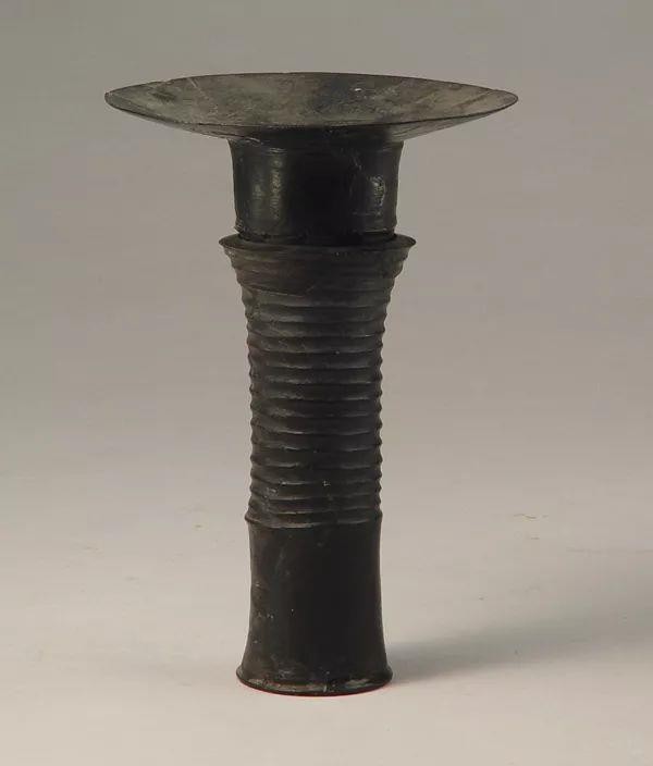 这件蛋壳黑陶高柄杯,1960年潍坊姚官庄遗址出土。整器为两部分套合,杯身作宽沿,直壁圜底,下承圆筒状且两端外侈的杯柄,上饰平行凹弦纹数周。该器以轮制而成,器壁薄如蛋壳,表面乌黑光亮。是山东新石器时代考古最重要的发现之一,也是典型龙山文化的重要标志。