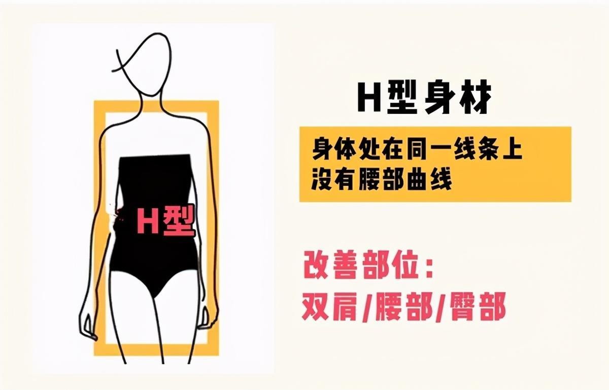一般情况下臀围较小,属于它的优势,但肩膀和臀部宽度基本一致,腰部所呈现的线条接近平坦,平直的下半身没有曲线感。它有瘦H和胖H之分,穿搭时要尤为注意凸显曲线感,增加女性美感会有意想不到的呈现。