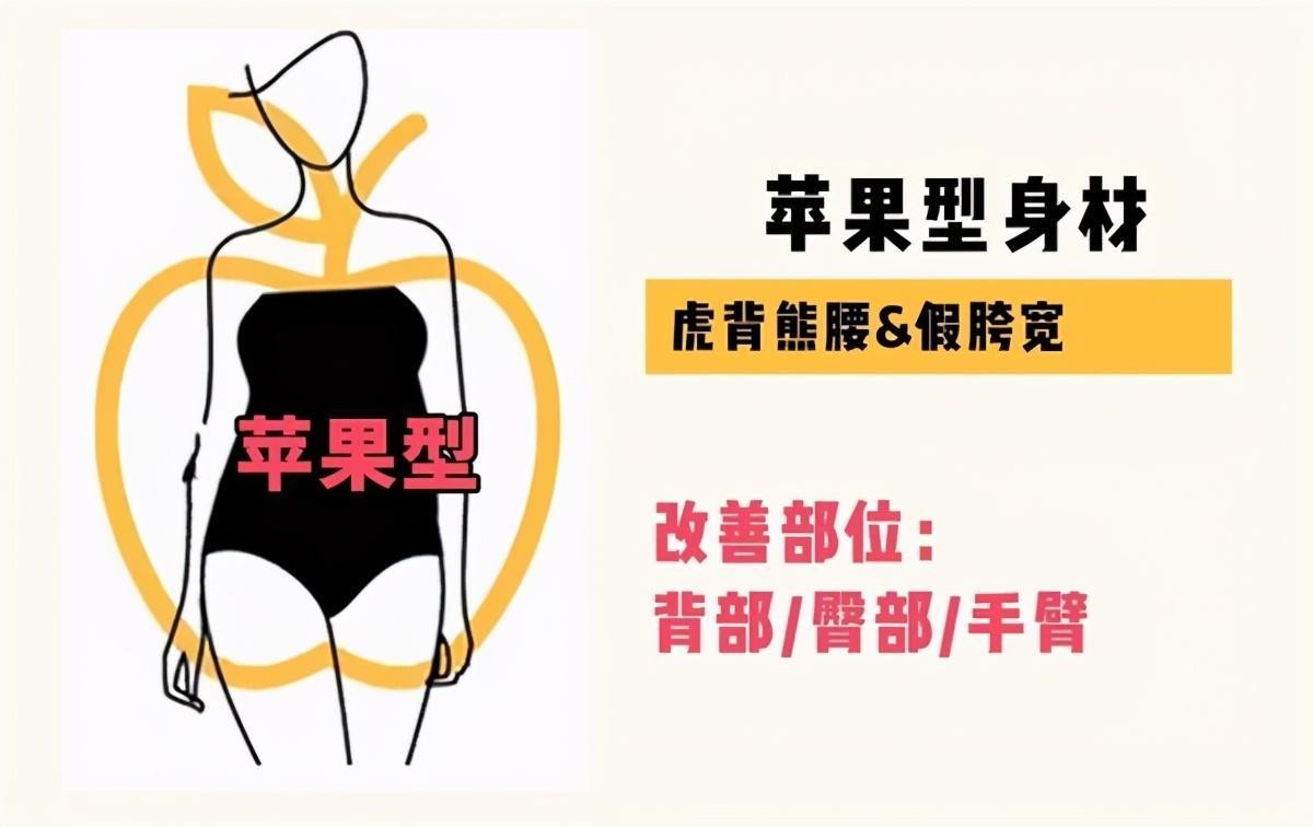 上身胖下身瘦是它的特点,具体体现在以下几点:肩背比较厚实,胸部比较丰满,肚子脂肪堆积多,中段较圆润,臀小。四肢纤细,相对来说腿比较长且纤细是苹果型身材的优势。