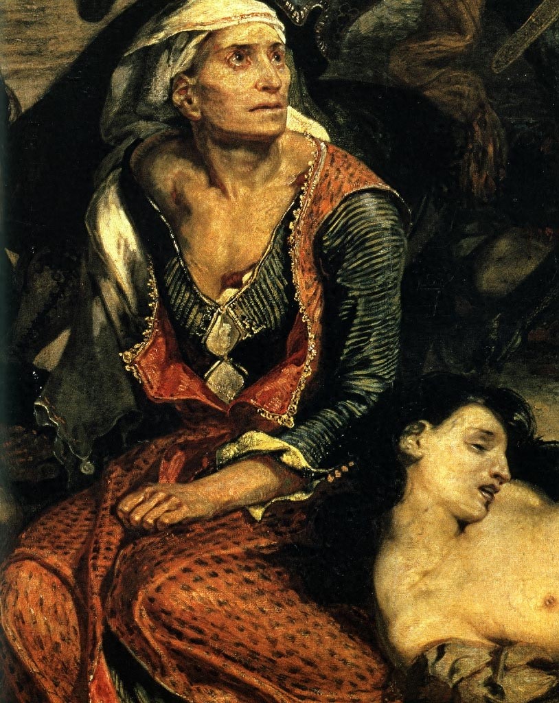 画中更坐着一位老妇,默然看着周围发生的一切,在她身旁,一对中年夫妇依偎在一起,财宝散落一地。画面右侧,一位倒在血泊中的母亲,她可怜的孩子还爬在她身上寻找乳汁。被凌辱的无辜希腊平民,同骑在高头大马上趾高气扬的侵略者形成对比,更激起人们的愤慨与同情。