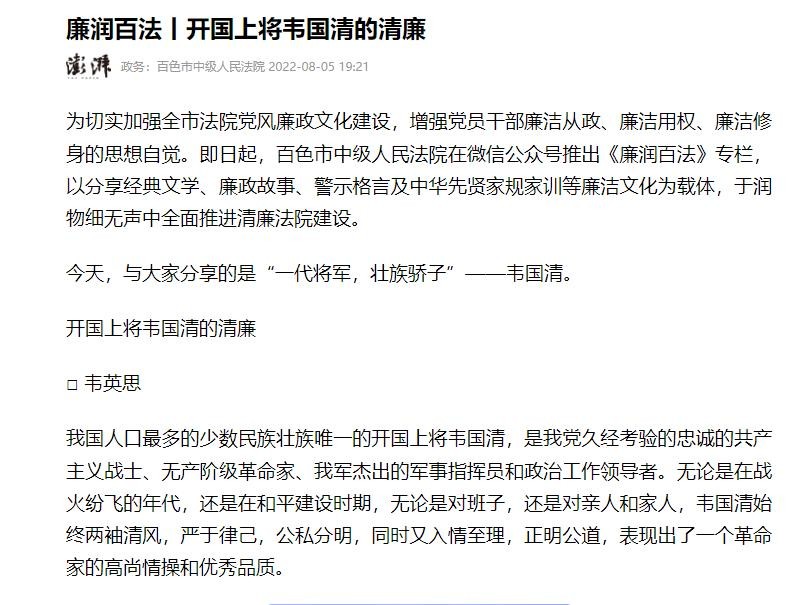 澎湃新闻网:开国上将韦国清的清廉