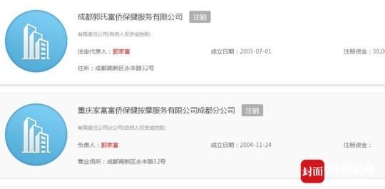 在成都工商局登记的信息显示,郭家富担任法人的两家公司,位于高新区永丰路的成都郭氏富侨保健服务有限公司和重庆家富富侨保健按摩服务有限公司成都分公司,不过均处于注销状态。