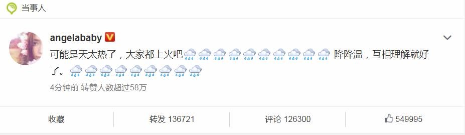 23日,baby发文回应机场事件,“可能是天太热了,大家都上火吧。降降温,互相理解就好了。”