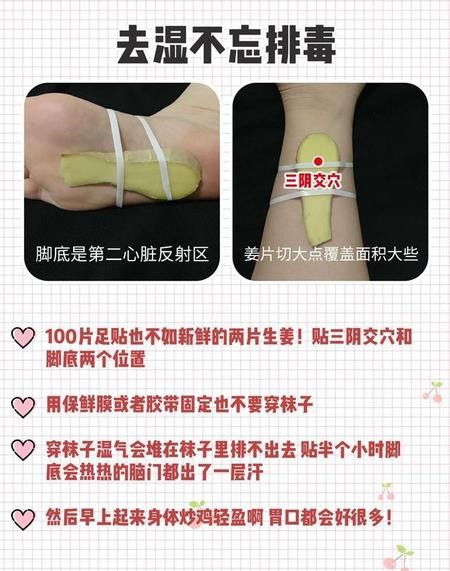 这个不需要熬乱七八糟的水~贴姜片就可以!100片足贴也不如新鲜的两片生姜!贴三阴交穴和脚底两个位置,用保鲜膜或者胶带固定也不要穿袜子 穿袜子湿气会堆在袜子里排不出去,贴半个小时脚底会热热的脑门都出了一层汗,然后早上起来身体炒鸡轻盈啊,胃口都会好很多!