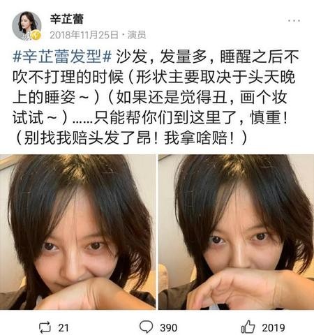 辛芷蕾首先是位不大不小的公众人物,自己的生活动态,也会引起好多人的关注,她可能看到有些人吐槽这个发型,才说了这样的一段话:沙发、发量多第二天头发的形状,完全取决于头天晚上睡觉的姿势……别找她赔头发,我们再来看看网上朋友,自拍的自认为失败的作品。