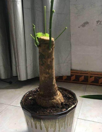 这就是我们养的发财树换盆以后要操作的,如果您的发财树变成光杆以后,想要救活也是很简单的,只要主干没有彻底的干瘪,都可以去操作。