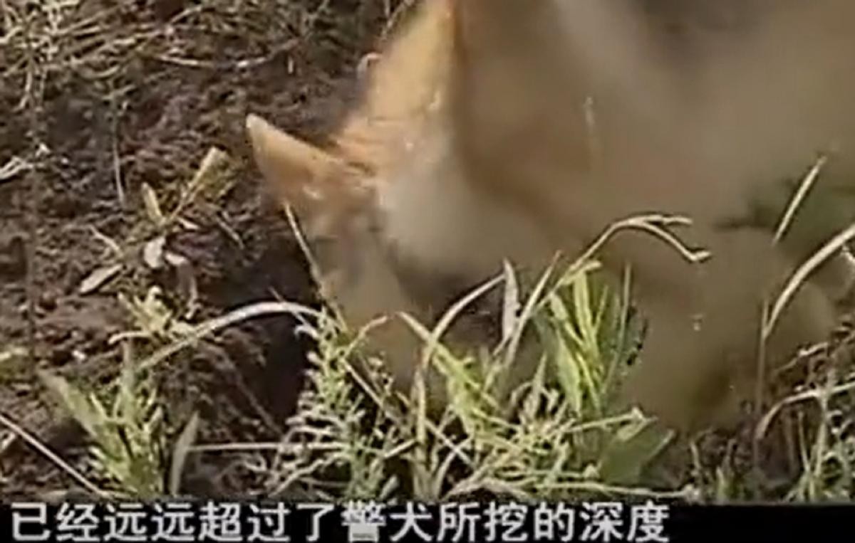 接下来就是挖掘。只见这条警犬只挖了三分之一就想放弃了,顾奎山摇着头,帮着警犬一起把牛肉挖了出来。