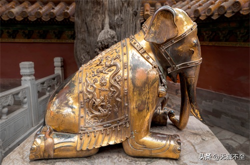 御花园承光门内侧有对明代制造的铜质鎏金跪象!《大清会典》中记载宝象的标准装束是:络首、钩膺、膺悬朱缨铜铃各三,白革为鞯,绘金龙彩云,周为花文。这对宝象正是这般装束,躬身下跪,寓意为富贵吉祥(负跪吉象)。