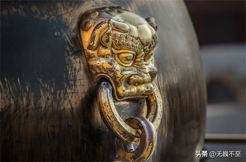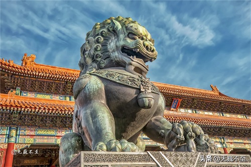 太和殿铜狮堪称中国第一神兽,600年沧桑尽显斑驳铜锈,铜狮身上45个螺髻为9、5相乘,寓意九五至尊!铜狮器宇轩昂,头饰鬈鬃,颈悬响铃,张嘴露牙,胸佩雕花绶带,前挂銮铃缨穗,足抚幼狮,矫首昂视,不怒而威。