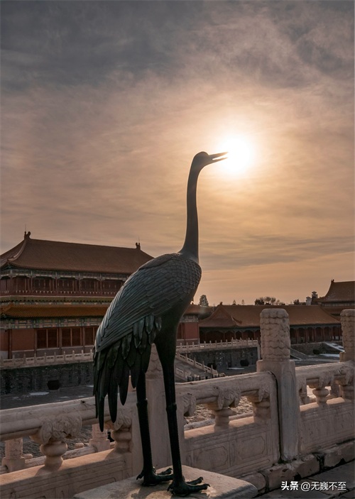 殿前丹墀上站立的青铜云鹤,高1.98米,与铜龟、日冕、嘉量一起,象征着国家统一、江山永固。