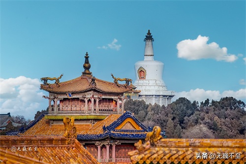 乾清门西侧墙根下的一排朝房就是著名的军机处。从这里望向西北方,可以看到历史最悠久而且最完整的皇家园林——北海公园标志性建筑,35.9米高的永安寺大白塔。