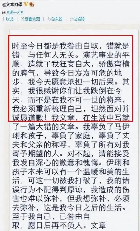 在周一见的零点四分,文章的认错微博,表明这一切都是他咎由自取的,文中也没有推卸任何责任,只是在大众以及向自己的家庭表明错误,并且表示愿意挽回婚姻!