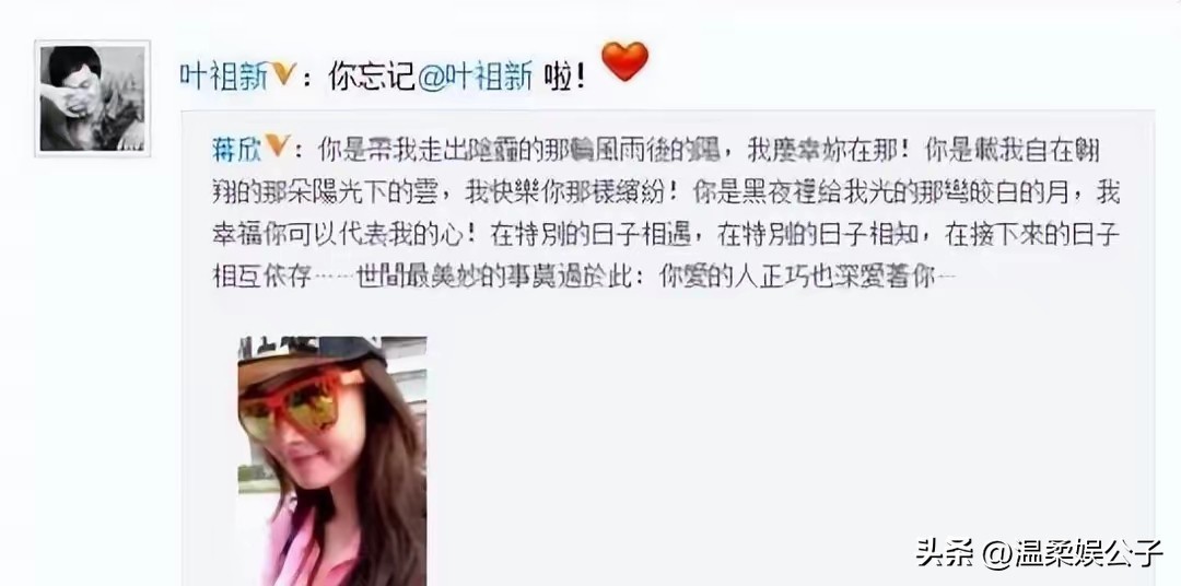 甚至于网络上传出一些关于叶祖新的风言风语时,蒋欣依旧无条件支持:全世界都背叛我,他不会。