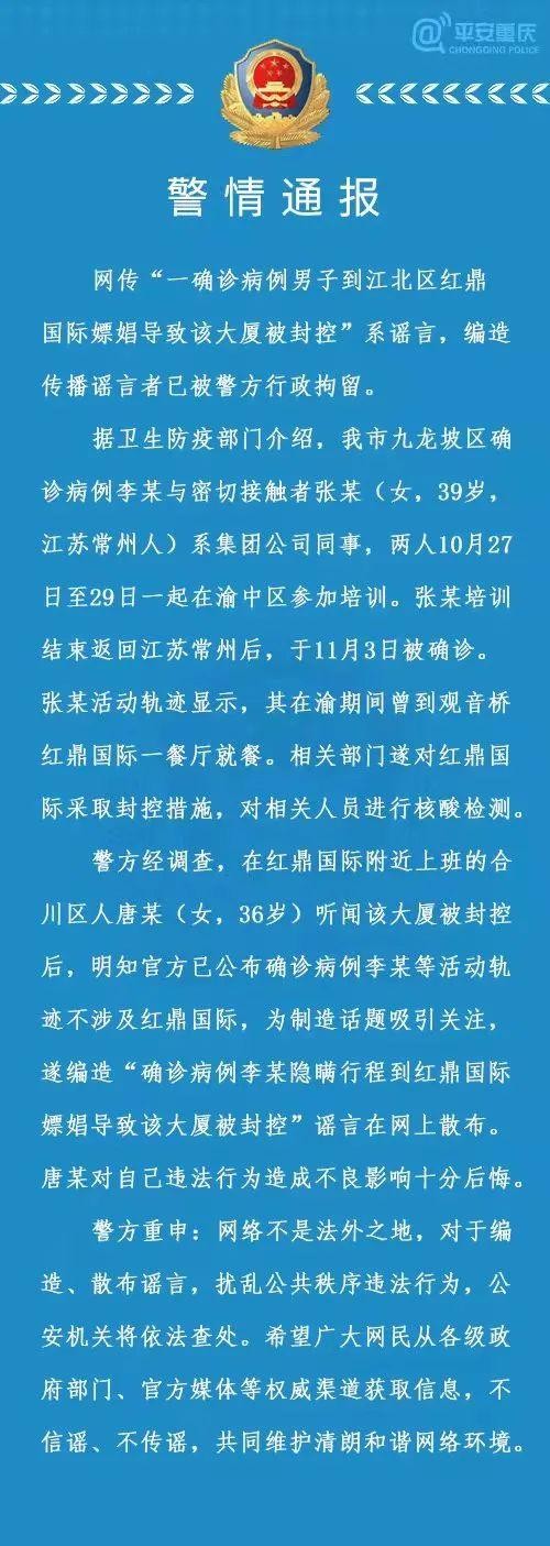 据重庆市公安局江北区分局5日通报,网传“一确诊病例男子到江北区红鼎国际嫖娼导致该大厦被封控”系谣言,编造传播谣言者已被行拘。