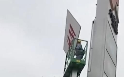 3月25日,一段视频显示,四川成都大悦城广场上的H&M商标被工作人员摘下。