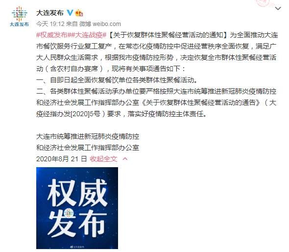 为全面推动大连市餐饮服务行业复工复产,在常态化疫情防控中促进经营秩序全面恢复,满足广大人民群众生活需求,根据我市疫情防控形势,决定恢复全市群体性聚餐经营活动(含农村自办宴席),现将有关事项通告如下: