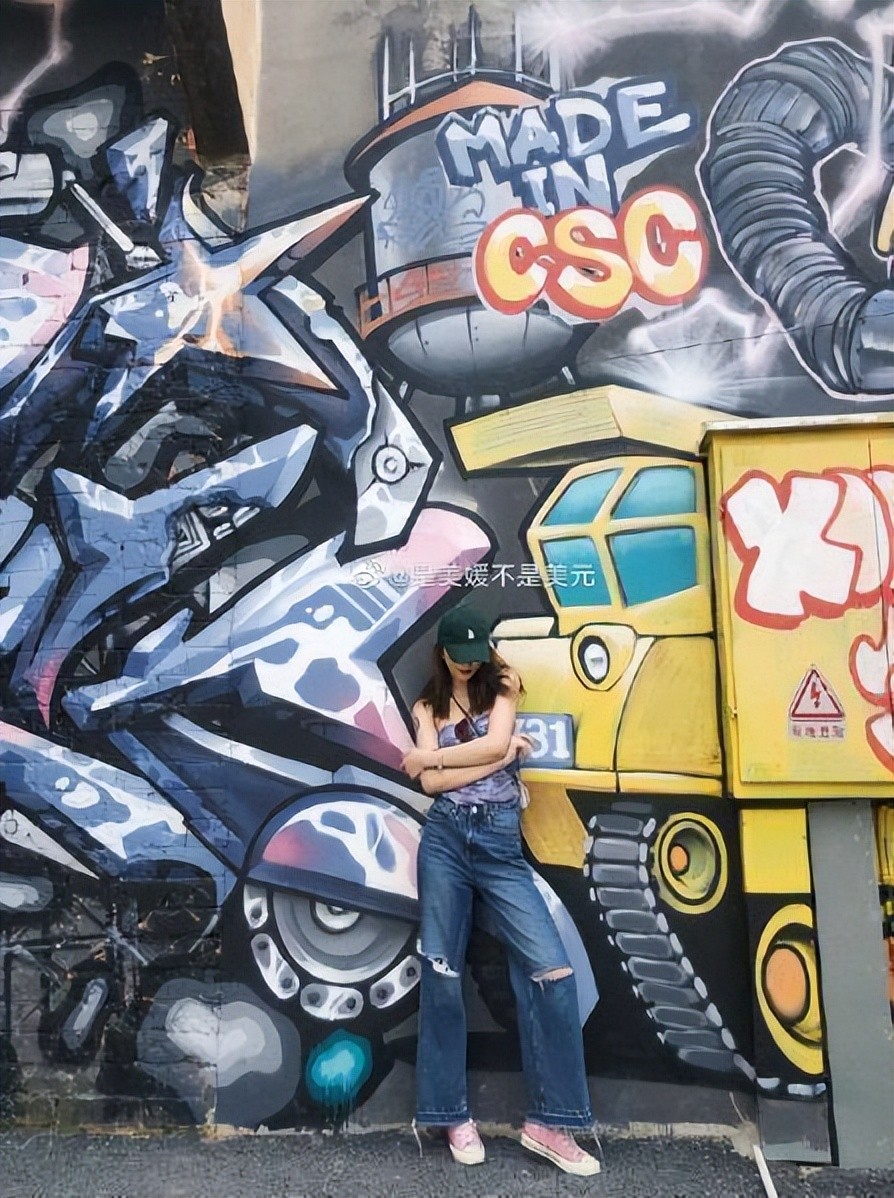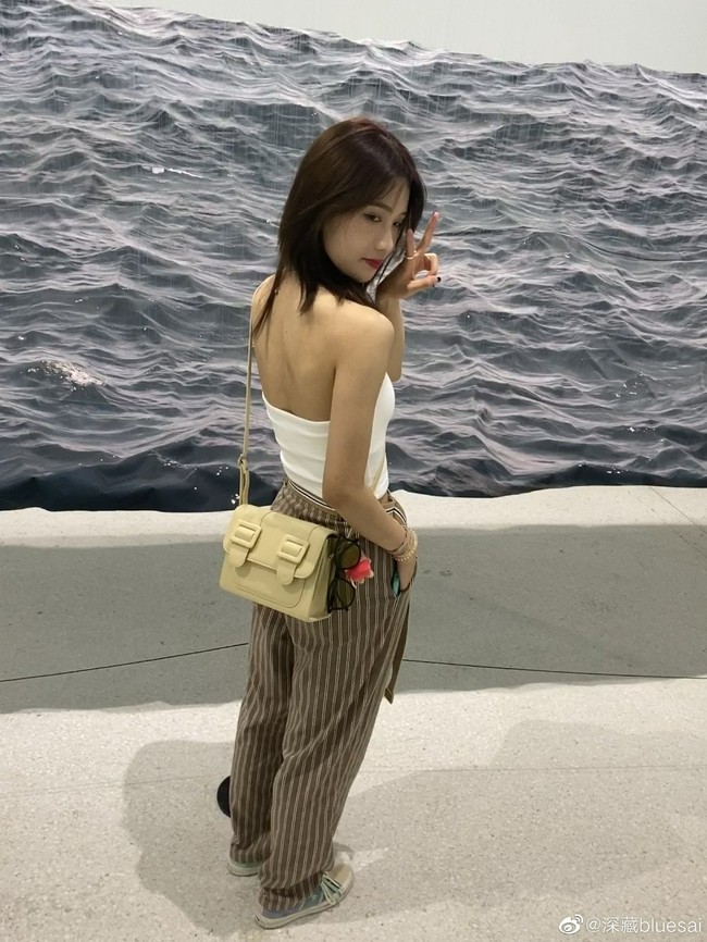 王美媛身穿米黄色吊带衣服,下身配了一条宽松额牛仔裤,将她完美的身材完全突显出来。