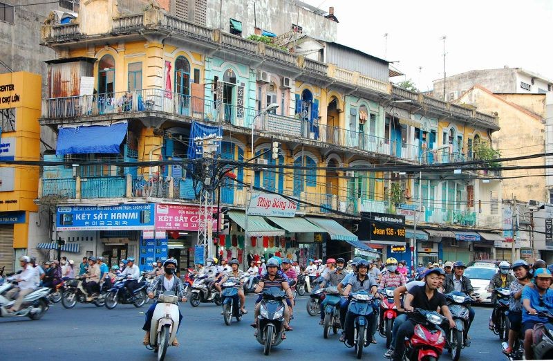 4.越南的民居建筑与中国有明显的不同。每栋民房都比较狭窄,门面一般为三到五米,多为两到三层,远远望去,就像一座座炮楼。