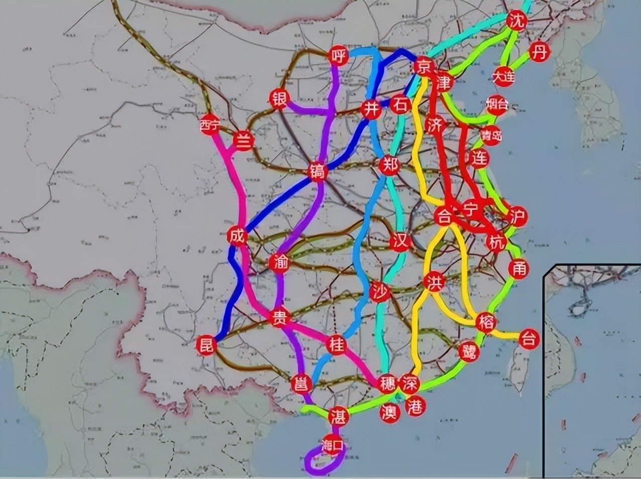 沿海通道:北起辽宁大连(丹东),南至广西北海(防城港) ,宛如一条蓝色丝带,串联起辽宁、河北、天津、山东、江苏、上海、浙江、福建、广东、广西等8省2市,线路全长超5090公里。它贯通了京津冀、辽中南、山东半岛、东陇海、长三角、海峡西岸、珠三角、北部湾等城市群 ,极大地促进了东部沿海地区的经济交流与协同发展。随着广汕高铁、福厦高铁、汕汕高铁的先后开通运营,以及漳汕高铁的开工建设,沿海通道建设取得重大突破。目前,仅沪乍杭、温福高铁仍在进行前期工作,预计2028年左右,350公里时速的超级沿海高铁将基本连通。京沪通道:从北京出发,途经天津、济南、徐州、蚌埠、南京,最终抵达上海 ,全程约1318公里。作为连接中国两大顶级城市的交通大动脉,它不仅是人员往来、商务交流的重要通道,也为京津冀和长三角两大经济圈的协同发展提供了强大助力。如今,潍宿高铁已经正式开工,计划于2028年6月底建成,未来京沪之间的交通将更加高效便捷。京港(台)通道:主线由京九高铁和合福高铁、福平铁路组成,在平潭预留未来连接台北的通道,通道建设总规模约4450公里。该通道从北京出发,一路向南,经衡水、菏泽、商丘、阜阳、合肥(黄冈)、九江、南昌、赣州、深圳,最终到达香港(九龙) 。它连接了华北、华中、华南地区,贯通了众多重要城市群,对促进区域间的经济融合、文化交流意义非凡。目前,雄商高铁、昌九高铁已开工建设,预计2026年京港通道主线将实现贯通 。京哈 - 京港澳通道:哈尔滨 - 北京 - 武汉 - 广州 - 香港高铁全线长3692公里,全程设计速度为350公里/小时,全程仅需10小时30分钟 。这条通道宛如一条南北走向的经济长廊,连接了东北、华北、华中、华南、港澳地区,贯通哈中、辽中南、京津冀、中原、长江中游、珠三角等城市群 。它的建成,极大地缩短了沿线城市间的时空距离,促进了区域间的产业转移与资源优化配置,为经济的协同发展注入了强大动力。呼南通道:从呼和浩特启程,途径大同、太原、郑州、襄阳、宜昌、常德、益阳、邵阳、永州、桂林,最终抵达广西南宁 ,总里程约2700公里,设计时速在200 - 350公里不等。它宛如一条纽带,将华北与华南地区紧密相连,对促进沿线地区的经济发展、加强区域间的联系具有重要意义。目前,宜昌至永州高铁的多个路段还处在前期阶段,预计2028年呼南通道将全部建成 。京昆通道:北京至昆明的高铁通道全长约2440公里,是我国建设难度最大的通道之一 。它从北京出发,经雄安、太原、西安、成都(重庆),最终到达昆明 。这条通道穿越了众多山脉、河流和复杂的地质区域,建设过程中面临诸多挑战。目前,建设难度最大的宜宾至昆明段、安康至重庆段分别将在2027年年底和2028年年底前建成通车,届时,京昆之间的交通将更加顺畅。包(银)海通道:主通道为包头至海口,支线为银川至西安,全长约2800公里,设计时速200 - 350不等 。该通道连接了华北、西北与华南地区,促进了不同区域间的资源互补与经济合作 。目前,银川至西安、重庆至贵阳、南宁至北海及海南段已建成,其他大部分区段仍处于在建和待建阶段 。兰(西)广通道:西宁至广州总里程约2340公里,时速200 - 300公里不等 。它从西宁出发,经成都(重庆)、贵阳,最终到达广州 。其中成都(重庆)至广州段均已建成,而成都至兰州(西宁)铁路的甘青段位于青藏高原边缘,穿越川西高原和横断山脉,建设难度极大,整个项目建成历经10多年时间。预计到2028年,兰(西)广通道将全线贯通 。